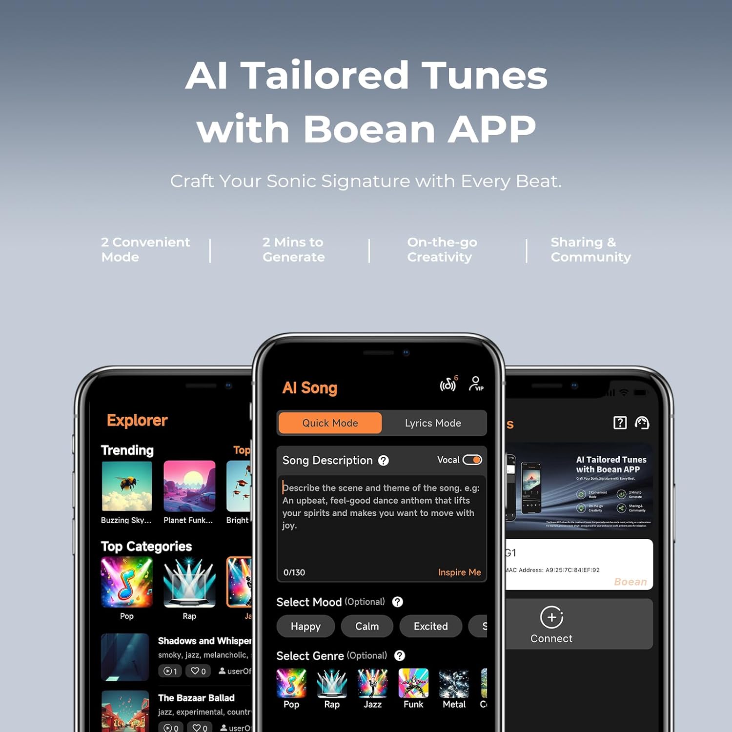 - Revolucionaria generación de música Boean AI – Libera la creatividad con nuestra aplicación Boean AI, ¡sin habilidades musicales! Convierte tu estado de ánimo, estilo o ideas en música original en solo 2 minutos. Personaliza géneros, instrumentos, ritmo y más para hacer tu propia obra maestra